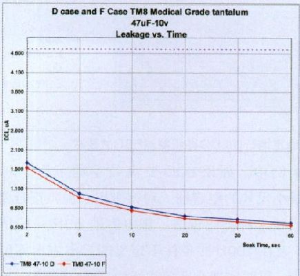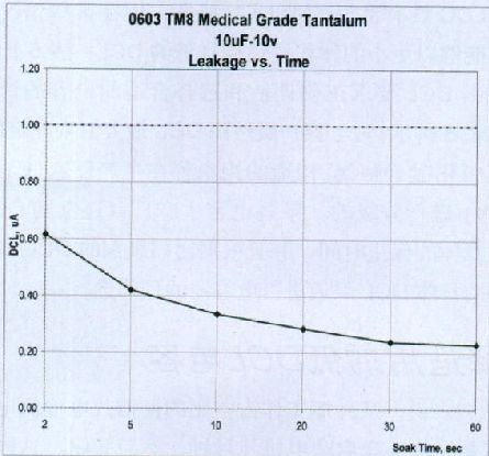 圖8是一種47uF-10V的鉭電容,雖然其最大DCL為4.7uA,根據特定的保壓時間篩選後,可為應用提供超低DCL.以圖8的元件為例,該批量可以按照10秒鍾DCL 600nA的標準篩選,從而把總體 DCL 從 4.7uA 降至 600nA 限值。