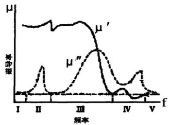 圖 3 是磁導率的頻散特性曲線,它可分為Ⅰ-Ⅴ個區域來分析。可見,在一定的頻率範圍內 μ'''' 值(在某一磁場下的磁導率)保持不變,然後隨頻率的升高磁導率 μ'''' 有一最大值。頻率再增加時,μ'''' 迅速下降。代表材料損耗的虛數磁導率 μ" 在低頻時數值較小,隨著頻率增加,材料的損耗(即μ")增加。