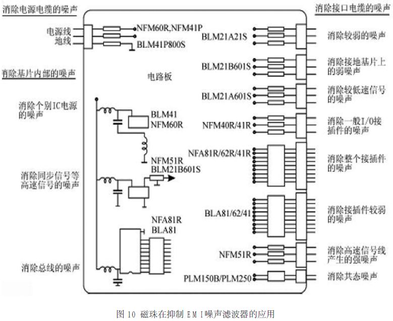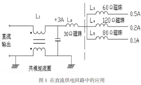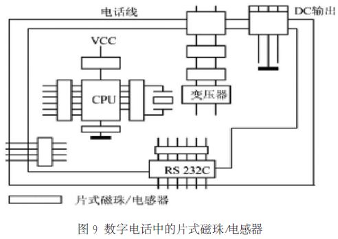 圖8、圖9、圖10 分別示出了磁珠在直流供電回路、數字電話、抑製 EMI 噪聲濾波器中的應用實例。