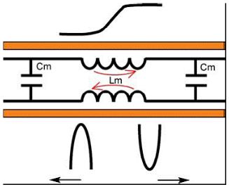 互阻抗沿著兩條走線呈均勻分布。串擾在數字門電路向串擾線打出上升沿時產生,並沿著走線進行傳播: