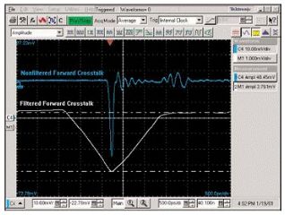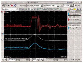 藍(lan)色(se)波(bo)形(xing)是(shi)由(you)白(bai)色(se)波(bo)形(xing)濾(lv)波(bo)後(hou)減(jian)緩(huan)了(le)脈(mai)衝(chong)上(shang)升(sheng)沿(yan)得(de)到(dao)的(de)波(bo)形(xing),它(ta)代(dai)表(biao)的(de)就(jiu)是(shi)對(dui)串(chuan)擾(rao)進(jin)行(xing)後(hou)濾(lv)波(bo)的(de)結(jie)果(guo)。圖(tu)中(zhong)顯(xian)示(shi)的(de)紅(hong)色(se)和(he)藍(lan)色(se)兩(liang)個(ge)串(chuan)擾(rao)波(bo)形(xing)是(shi)以(yi)相(xiang)同(tong)的(de)電(dian)壓(ya)刻(ke)度(du)顯(xian)示(shi)的(de)。