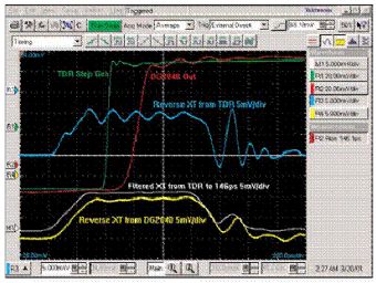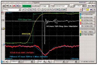 綠色波形是快沿TDR脈衝(R1),白色波形(R4)是由它導致的串擾。