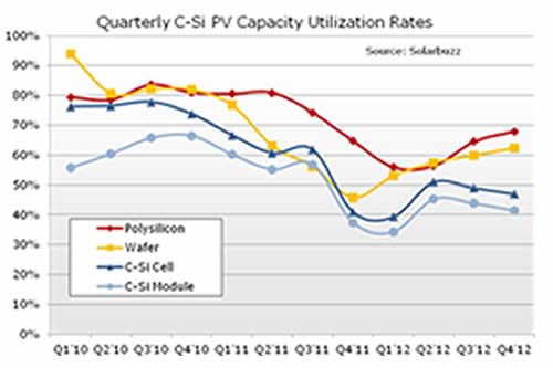 由於產能擴張速度過快,多晶矽和矽片製造環節的產能利用率在2011年也出現了大幅的下降,在第四季度都達到全年最低點。隨著廠商清理庫存過程的完成以及需求的回暖,預計在2012年矽片和多晶矽的產能利用率將先後回歸到正常水平。