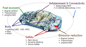 汽車電子器件有助於通過引擎的控製、檢測和驅動來提高效率。精心控製的關鍵部件(如噴油器和氣門)可達到最高效率。為了提高控製能力,需要對燃燒室壓力進行實時測量和處理,可減少汽油引擎30%的燃料消耗。