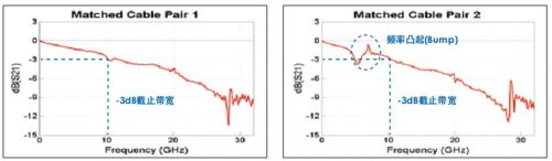 圖1,匹配電纜對的頻率響應,額定帶寬為18GHz。-3dB截止帶寬實際上大約為10GHz,低di於yu額e定ding帶dai寬kuan。除chu此ci之zhi外wai,兩liang條tiao電dian纜lan的de特te性xing不bu相xiang似si,可ke能neng在zai部bu分fen信xin號hao內nei容rong過guo度du衰shuai減jian或huo放fang大da時shi導dao致zhi波bo形xing失shi真zhen。特te別bie是shi在zai第di二er條tiao匹pi配pei電dian纜lan對dui上shang,可ke以yi在zai5GHz~8GHz之間看到頻率響應凸起