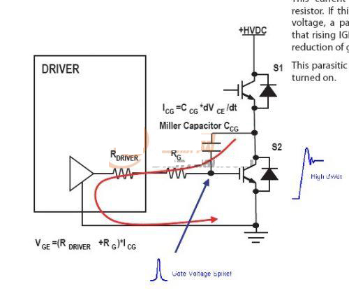 如上圖所示,當上官開通的時候,此時是截止的,由於上官開通的時候,這個時候要引入DV/DT的概念,這個比較抽象,先不管它,簡單通俗的說就是上管開通的時候,上管等效為直通了,+DC400V電壓立馬加入到下管的C級上,這麼高的電壓立刻從IGBT的寄生電容上通過產生一個感應電流,這個感應電流上圖有公式計算,這個電流在RG電(dian)阻(zu)和(he)驅(qu)動(dong)內(nei)阻(zu)的(de)共(gong)同(tong)作(zuo)用(yong)下(xia),在(zai)下(xia)管(guan)的(de)柵(zha)極(ji)上(shang)構(gou)成(cheng)一(yi)個(ge)尖(jian)峰(feng)電(dian)壓(ya),如(ru)上(shang)麵(mian)那(na)個(ge)示(shi)波(bo)器(qi)的(de)截(jie)圖(tu)所(suo)示(shi)。到(dao)目(mu)前(qian)為(wei)止(zhi),沒(mei)有(you)引(yin)入(ru)米(mi)勒(le)電(dian)容(rong)的(de)概(gai)念(nian),理(li)解(jie)了(le)這(zhe)些(xie),然(ran)後(hou)對(dui)著(zhe)規(gui)格(ge)書(shu)一(yi)看(kan),米(mi)勒(le)電(dian)容(rong)是(shi)什(shen)麼(me),對(dui)電(dian)路(lu)有(you)何(he)影(ying)響(xiang),就(jiu)容(rong)易(yi)理(li)解(jie)多(duo)了(le)。