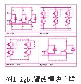 隨著市場對兆瓦級大功率變流器的需求激增,目前igbt並聯方案已成為一種趨勢。因為igbt並聯能夠提供更高的電流密度、均勻的熱分布、靈活布局以及較高的性價比(這取決於器件及類型)。通過將小功率igbt模塊(包括分立式igbt)、大功率igbt模塊進行並聯組合,可獲得不同額定電流的等效模塊,而且實現並聯的連接方式也靈活多樣。以高壓變頻器中廣泛采用的h橋拓撲結構功率單元為例,其並聯實現可以用不同電路結構的igbt模塊,如半橋“ff”、單個“fz”、四單元“f4”和六單元“fs”,如圖1所示。並聯可降低模塊熱集中,使其獲得更加均勻的溫度梯度分布,較低的平均散熱器溫度,這有益於提高熱循環周次。因此,igbt並聯是大功率設計應用的最佳解決方案之一。