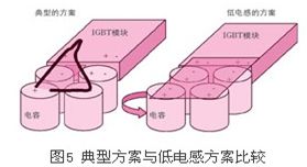 (2)疊層母線的布局中應注意電流路徑、電容端子布局等問題,可以有效的減少雜散電感,提高係統的抑製過電壓能力。