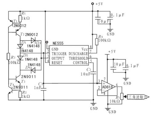 三角波產生電路如圖2所示。采用NE555芯片構成三角波電路,通過恒流源對電容C1實現線性充放電從而獲得三角波。開始工作時,555芯片3號腳為高電平,二極管D4導通,D3截止,從而D1導通,D2截止,由T1、T2、R1構成的恒流源通過D1對C1線性充電,當充電使C1兩端電壓達到2/3Vcc時,3號腳輸出電平發生反轉,變為低電平,此時D1、D2、D3、D4導通狀態也完全相反,由下方T3、T4、R2構成的恒流源通過D2對C1線性放電,當放電使C1兩端電壓達1/3Vcc時,3號腳又反轉為高電平,如此循環往複,實現周期三角波信號產生。由C1兩端引出輸出,即可得到線性度良好的三角波信號,後接一級同相跟隨器已達到前後級隔離的目的。C1采用漏電流低、響應速度快的聚苯乙烯電容,保證較好性能。