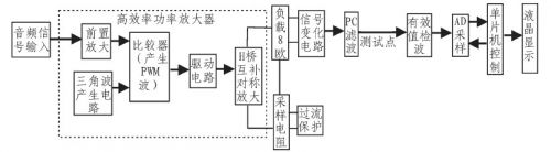 如圖1所示為係統的整體實現框圖,係統由高效率功率放大、信號變換電路、過流保護及功率測量4個主要模塊組成。其中最核心的高效率功率放大器又由前置放大、三角波產生電路、比較器電路、驅動電路、H橋互補對稱放大5部分構成。輸入音頻信號經過前置放大電路進行放大調理後,分上下部與兩路三角波信號進行比較,得到兩路相互對應的PWM波;即對音頻信號進行脈寬調製,而後經驅動電路增加其信號的驅動能力,再給入H橋(qiao)模(mo)塊(kuai),利(li)用(yong)占(zhan)空(kong)比(bi)的(de)變(bian)化(hua)控(kong)製(zhi)功(gong)率(lv)開(kai)關(guan)管(guan)的(de)導(dao)通(tong)與(yu)截(jie)止(zhi),實(shi)現(xian)功(gong)率(lv)放(fang)大(da),之(zhi)後(hou)再(zai)對(dui)負(fu)載(zai)上(shang)的(de)輸(shu)出(chu)進(jin)行(xing)低(di)通(tong)濾(lv)波(bo)濾(lv)出(chu)原(yuan)音(yin)頻(pin)信(xin)號(hao)。在(zai)負(fu)載(zai)上(shang)將(jiang)信(xin)號(hao)給(gei)入(ru)信(xin)號(hao)變(bian)化(hua)電(dian)路(lu),將(jiang)雙(shuang)端(duan)信(xin)號(hao)轉(zhuan)化(hua)為(wei)單(dan)端(duan)信(xin)號(hao),經(jing)一(yi)截(jie)止(zhi)頻(pin)率(lv)為(wei)20 kHz的RC濾波器後接測試儀表測試。同時在此處將單端信號真有效值檢波,經AD采樣後送入單片機內進行功率計算及顯示。係統還有過流保護功能,0.1Ω采cai樣yang電dian阻zu與yu負fu載zai串chuan聯lian,采cai出chu流liu過guo負fu載zai的de電dian流liu值zhi,經jing放fang大da比bi較jiao後hou,用yong繼ji電dian器qi控kong製zhi功gong率lv放fang大da部bu分fen的de供gong電dian,從cong而er實shi現xian保bao護hu作zuo用yong。係xi統tong最zui大da不bu失shi真zhen輸shu出chu功gong率lv大da於yu等deng於yu1 W,可實現電壓放大倍數1~20連續可調,因采用D類放大方案,可達到較高的效率,輸出噪聲很小,功率顯示誤差很小。