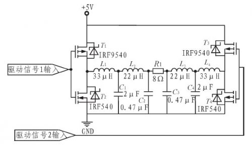 H橋互補對稱電路如圖4.采用低導通電阻、開關速率快、受溫度影響小的場效應對管IRF9540和IRF540組成互補推挽放大電路。運用對稱輸出方式,充分利用電源電壓,浮動輸出載波峰峰值量大可達10 V,有效地提高了輸出功率。