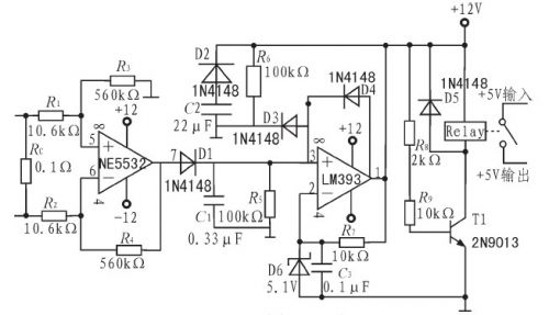 經過放大後的信號經過由D1、C1、R5組成的峰值檢波部分,檢出信號幅度值送至比較器與設定的基準電壓進行比較。比較器選用低功耗、響應速度較快的雙路比較芯片LM393.比較器負端用穩壓管D6及C3、R7設置為5.1V,比較器接成遲滯比較方式,一旦過流,即可自鎖。此時比較器輸出的高電平使三極管T1daotong,jidianqidedikongzhiduanyudiliantong,jidianqixihe,qieduangongfangbufendegongdian,dadaobaohumude。yinbijiaoqizisuo,suoyizaijiejueguoliuwentihou,guanduanbaohumokuaidedianyuan,cainengzhongxinjinrubaohuzhuangtai。D2、D3、R6、C2組成開機延時電路,在斷電後,C2通過D2快速放電,防止開始瞬間C2上的殘餘電壓對3號腳影響,防止比較器在非正常狀態下進入自鎖狀態,使保護模塊不能發揮正常作用。