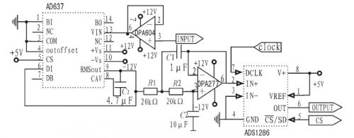 輸入綴用OPA604構成一射極跟隨器已達到隔離前後級的作用。改變平均電容的值可設定平均時間常數,並決定低頻準確度、輸shu出chu波bo紋wen的de大da小xiao和he穩wen定ding時shi間jian。交jiao流liu波bo紋wen分fen量liang可ke以yi用yong增zeng大da此ci電dian容rong的de值zhi來lai減jian少shao,但dan這zhe樣yang會hui使shi建jian立li時shi間jian增zeng大da,所suo以yi選xuan擇ze用yong後hou接jie一yi個ge二er階jie有you源yuan低di通tong濾lv波bo器qi的de方fang法fa來lai減jian少shao輸shu出chu的de紋wen波bo。得de出chu真zhen有you效xiao值zhi後hou直zhi接jie給gei入ruADS1286進行模數轉換,再由FPGA處理,計算出係統的輸出功率並進行顯示。