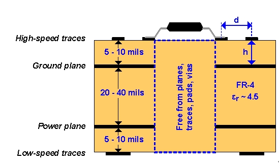 將電源層置於接地層下麵。這兩個參考層構成了一個大約為100pF/in2的附加高頻旁路電容器。