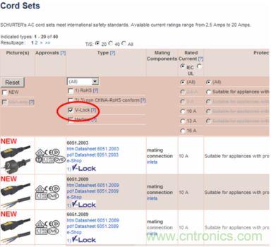 在網頁選型工具“cord sets”(電源線)中,選擇V-Lock標簽及諸如連接器類型、國家插頭或其它特性等選擇標簽,即可輕鬆選擇。