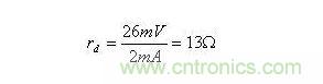 ID為靜態電流,常溫下UT=26mV。可知,靜態電流ID越大,rd將越小。設UD=0.7V時,ID=2mA。由此可得直流電阻RD=350,而動態電阻(交流電阻)為: