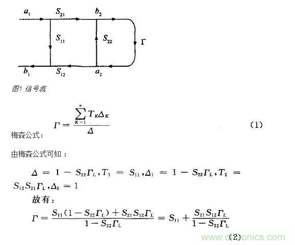 信號流圖(如圖1所示)結合散射參數是分析微波網絡和微波測量係統的簡便有效方法。流圖公式亦稱梅森不接觸環法則(Mason’s non-touching loop rule),簡稱梅森公式。根據梅森公式可以直接求出信號流圖中任意兩點之間的傳輸值。