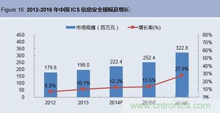 2014藍皮書還指出2013年中國信息安全市場總體規模為194億元,其中工業領域信息安全為23.28億元,占中國信息安全市場的12%。中國工業控製係統(ICS)信息安全市場整體規模為1.98億元,同比增長10.1%,相比2012年增速提高3.3個百分點。