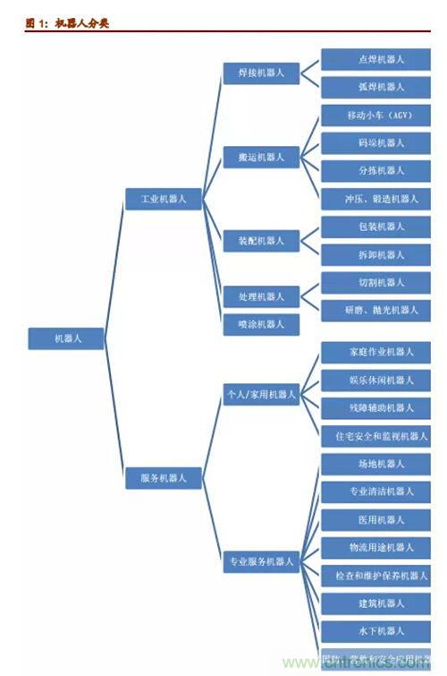 jiqirenzhuanjiacongjiqirenyingyonghuanjingchufa,jiangjiqirenfenweiliangdalei,jigongyejiqirenhefuwujiqiren。gongyejiqirengenjuyongtubutong,dazhikeyifenweihanjiejiqiren、搬運機器人、噴漆機器人、塗膠機器人、裝配機器人、碼垛機器人、切割機器人、自動牽引車(AGV)機器人、淨室機器人等。而服務機器人則是除工業機器人之外的、用於非製造業並服務於人類的各種先進機器人,主要包括個人/家用服務機器人和專業服務機器人。其中,個人/家用機器人主要包括:家庭作業機器人、娛樂休閑機器人、殘障輔助機器人、住宅安全和監視機器人等;專業服務機器人主要包括:場地機器人、專業清潔機器人、醫用機器人、物流用途機器人、檢查和維護保養機器人、建築機器人、水下機器人,以及國防、營救和安全應用機器人等等。