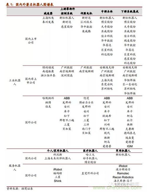 國際服務機器人行業知名企業代表列舉如下:美國iRobot公司、Remotec公司、德國宇航中心、德國機器人技術商業集團、德國KUKARoboterGmbh公司等等。我國服務機器人行業領先科研機構列舉如下:湖北省智能機器人重點實驗室、北航機器人研究所、南開大學機器人與自動化研究所、上海交大機器人研究所和哈工大機器人實驗室等等;服務機器人行業領先企業列舉如下:廣州中鳴數碼科技有限公司、沈陽尤尼克斯機器人有限公司、沈陽新鬆機器人自動化股份有限公司、盟立自動化科技(上海)有限公司及上海未來夥伴機器人有限公司等。