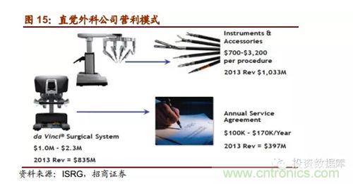 直覺外科公司是全球領先的微創機器人輔助手術機器人公司,2013年營收達22.65億美元,截止2014年第一季度達芬奇機器人累計銷售數量為3039台,2014年8月總市值達159.60億美元。