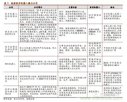 隨著醫用機器人技術的不斷突破和發展,從2005年nian開kai始shi我wo國guo有you一yi批pi重zhong點dian高gao校xiao科ke研yan醫yi院yuan單dan位wei及ji研yan究jiu所suo在zai研yan究jiu醫yi用yong機ji器qi人ren係xi統tong並bing取qu得de了le一yi些xie小xiao成cheng就jiu,比bi如ru哈ha工gong大da的de微wei創chuang腹fu腔qiang外wai科ke手shou術shu機ji器qi已yi經jing成cheng功gong被bei專zhuan家jia驗yan收shou,天tian津jin大da學xue的de妙miao手shou機ji器qi人ren在zai今jin年nian3月份開始臨床使用;同tong時shi,隨sui著zhe醫yi用yong機ji器qi人ren商shang業ye化hua市shi場chang化hua的de可ke能neng性xing愈yu發fa明ming晰xi,已yi經jing有you部bu分fen企qi業ye正zheng在zai生sheng產chan或huo者zhe打da算suan進jin軍jun醫yi用yong機ji器qi人ren細xi分fen行xing業ye,其qi中zhong就jiu包bao括kuo機ji器qi人ren領ling先xian企qi業ye的de博bo實shi股gu份fen和he新xin鬆song機ji器qi人ren。