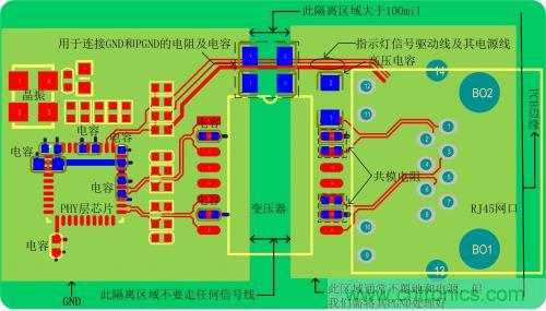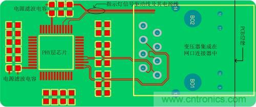 1.圖 2網口變壓器沒有集成在網口連接器裏的參考電路PCB布局、布線圖,下麵就以圖 2介紹以太網電路的布局、布線需注意的要點。
