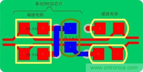 c)網口變壓器PHY層芯片側中心抽頭對地的濾波電容要盡量靠近變壓器管腳,保證引線最短,分布電感最小;