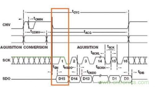 公司帶SPI接口的許多SAR ADC都是從CS或CNV的下降沿為MSB提供時鍾信號,剩餘的數據位則跟隨SCLK的下降沿,如圖3所示。在讀取MSB數據時,要使用等式中的tEN而非tDRV。