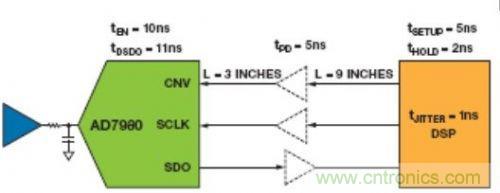 在圖4中,DSP主機訪問AD7980處於3線CS模式下,其中,VIO = 3.3 V。DSP鎖存SCLK下降沿上的SDO信號。DSP的額定最小建立時間為5 ns,最小保持時間為2 ns。對於典型的FR-4PCB板,傳播延遲約為180 ps/in。緩衝器的傳播延遲為5 ns。CNV、SCLK和SDO的總傳播延遲為