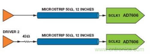 在圖7中,一個驅動器通過一條12英寸的微帶線路連接SCLK1,另一個驅動器通過一個與微帶串聯的43Ω電阻連接SCLK2。