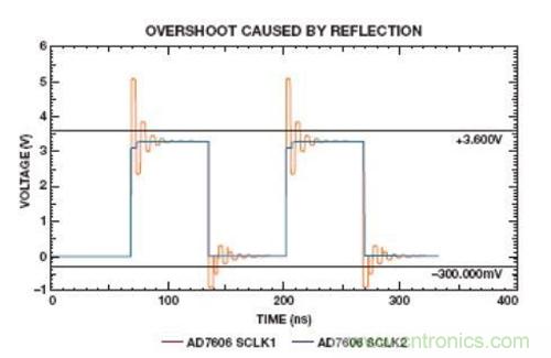 在圖8中,SCLK1上的大過衝違反了–0.3 V至+3.6 V的絕對最大額定值。串聯電阻可減小SCLK2上的壓擺率,使信號處於額定值之內。