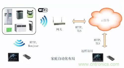 從上圖可看出,家庭自動化係統將嵌入式微控製器技術、無線連接、接入網絡融合為一體。Apps軟件能夠使用戶發現家裏的設備,予以設置,或者創建一個動作加以控製。