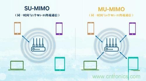 但MIMO(也稱SU-MIMO,即單用戶多輸入多輸出)也有自己的缺陷——會產生MIMO間隙。簡單來說就是目前我們熟悉的無線路由/AP大都有3-4根天線,但WiFi終端通常隻有1-2根天線。而采用MIMO技術的無線路由/AP同一時間隻能與1個WiFi終端建立連接和通訊,因此WiFi終端很難全部占用所有傳輸信道,即無法占滿無線路由/AP的全部容量,這種差異就被稱為MIMO間隙。