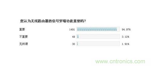 隨著Wi-Fi終端的大量普及,人們對於無線路由器的需求也越來越高,不過在此前展開的有獎調查活動中,從收集到的大約1500份反饋裏,有高達94.97%的(de)參(can)與(yu)者(zhe)認(ren)為(wei)無(wu)線(xian)路(lu)由(you)器(qi)的(de)信(xin)號(hao)穿(chuan)牆(qiang)功(gong)能(neng)相(xiang)當(dang)重(zhong)要(yao)。可(ke)見(jian)人(ren)們(men)在(zai)選(xuan)擇(ze)無(wu)線(xian)路(lu)由(you)器(qi)產(chan)品(pin)時(shi),信(xin)號(hao)能(neng)否(fou)穿(chuan)牆(qiang),覆(fu)蓋(gai)範(fan)圍(wei)怎(zen)麼(me)樣(yang),已(yi)經(jing)成(cheng)為(wei)他(ta)們(men)采(cai)購(gou)時(shi)的(de)首(shou)要(yao)考(kao)察(cha)因(yin)素(su)。
