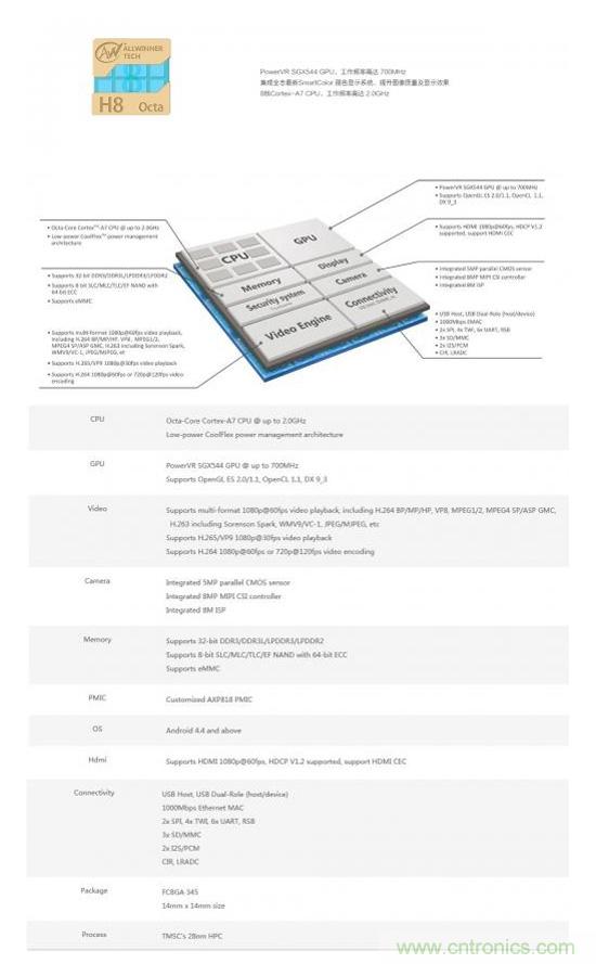 多媒體方麵, H8支持多格式1080p@60fps視頻編解碼, 支持H.265/HEVC視頻處理,集成8M ISP圖像信號處理架構,可支持800萬像素攝像頭。 顯示方麵,H8支持HDMI 1080p@60fps顯示,支持HDCP V1.2協議,支持HDMI CEC。此外,H8集成了全誌新一代麗色顯示技術,圖像顯示質量進一步提升。事實上,H8芯片最早是應用於電視盒子。