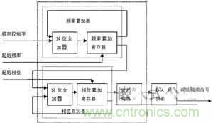 圖1所示的DDS原理框圖是用於實現固定頻率的正弦波信號,按照公式(3)的思路實時改變ΔΦ,即可產生線性調頻信號。