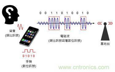 現在的手機是屬於「數字通信」,也就是我們講話的聲音(連續的模擬信號),先由手機轉換成不連續的 0 與 1 兩種數字信號,再經由數字調變轉換成電磁波(模擬信號載著數字信號),最後從天線傳送出去,原理如圖一所示。