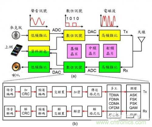 數字通信係統的架構如圖二(a)所示,使用者可能使用智能型手機打電話進行語音通信或上網進行數據通信,我們分別說明如下: