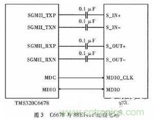 C6678和PHY芯片88E1111的接口電路如圖3所示。88E1111工作在SGMII接口模式下,不需要TXCLK時鍾輸入,更有助於減少電路板上走線的數量,同時也可減少噪聲的產生。