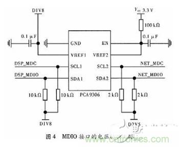 因為88E1111上集成的MDIO與C6678集成MDIO模塊進行連接時,電壓有所差別,前者電壓為2.5 V,後者電壓為1.8 V,所以在二者之間應該添加電壓轉換器。本文采用一片PCA9306,實現2.5 V和1.8 V之間的電平轉換,其連接電路如圖4所示。