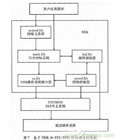SYS/BIOS為wei整zheng個ge軟ruan件jian提ti供gong集ji成cheng開kai發fa環huan境jing,不bu僅jin擁yong有you適shi合he實shi時shi係xi統tong的de多duo線xian程cheng優you先xian搶qiang占zhan機ji製zhi,還hai可ke添tian加jia需xu要yao的de封feng裝zhuang庫ku,使shi得de編bian寫xie程cheng序xu時shi可ke以yi更geng加jia方fang便bian地di調tiao用yong庫ku函han數shu。NDK是DSP的網絡程序開發集成工具,其中,stack.lib給出了從頂層socket到底層PPP關於TCP/IP協議棧的封裝庫;nettool.lib提供用於socket網絡套接字和用於網絡應用開發工具的封裝庫;os.lib提供應用於SYS/BIOS和網絡編程套件之間的係統協調的封裝庫;hal.lib提供外圍設備和網協議棧之間接口的封裝庫;netctrl.lib提供DSP網絡編程的整體控製,可用來配置底層驅動和協議。