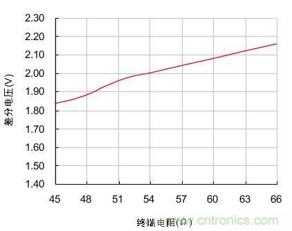 在負載電阻由45Ω不斷增大到66Ω時,節點的輸出差分電壓也隨著由1.84V增大到2.16V,兩者近似線性關係。為了使發送節點的輸出差分電壓不至於過低,實際組網時負載電阻應在圖 1測試的範圍內波動。我們分析RL的組成有3個:終端電阻、總線節點的差分輸入電阻、總線本身的有效電阻。