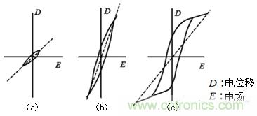 向鈦酸鋇係鐵電體施加直流電壓時,電場小時,電位移(D)與電場(E)成正比,但隨著電場增大,原本方向混亂的自發極化(Ps)開(kai)始(shi)沿(yan)電(dian)場(chang)的(de)方(fang)向(xiang)整(zheng)齊(qi)排(pai)列(lie),顯(xian)示(shi)非(fei)常(chang)大(da)的(de)介(jie)電(dian)常(chang)數(shu),實(shi)際(ji)靜(jing)電(dian)容(rong)量(liang)值(zhi)增(zeng)大(da)。隨(sui)電(dian)場(chang)進(jin)一(yi)步(bu)增(zeng)強(qiang),不(bu)久(jiu)自(zi)發(fa)極(ji)化(hua)整(zheng)齊(qi)排(pai)列(lie)完(wan)畢(bi),分(fen)極(ji)飽(bao)和(he)後(hou),介(jie)電(dian)常(chang)數(shu)變(bian)小(xiao),實(shi)際(ji)靜(jing)電(dian)容(rong)量(liang)值(zhi)變(bian)小(xiao)(參照圖2)。