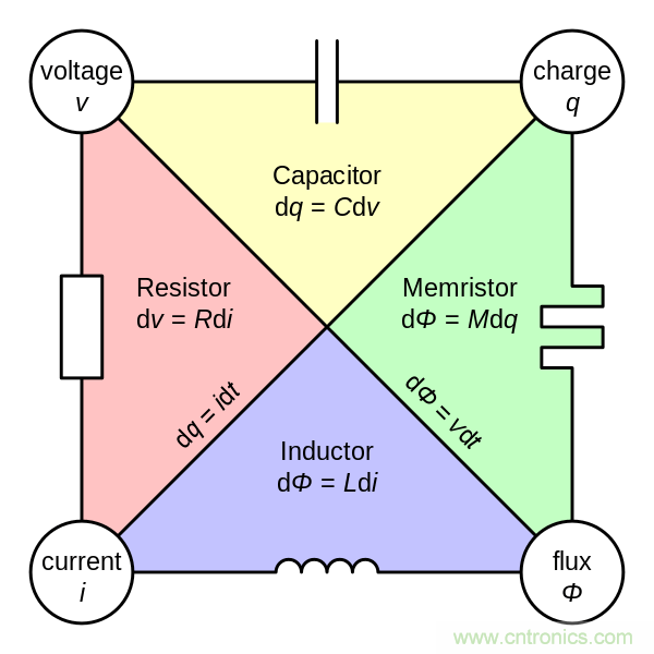 ▲ 電阻器、電容器、電感器和憶阻器概念之間的對稱性。