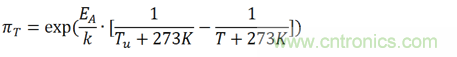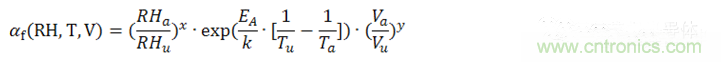 公式中,αf為測試的加速因子,也就是加速(後綴為a)測試條件下MTTF(Mean Time To Failures,平均無故障時間)與參考(後綴為u)測試條件下MTTF之比。EA是活化能,在0.79eV和0.95eV之間,k為玻爾茲曼常數。指數x為相對濕度的影響,指數y為電壓的影響,都是經驗數據,但是必須通過實際評估來確認。我們把此加速模型擴展到壽命預估模型中。
