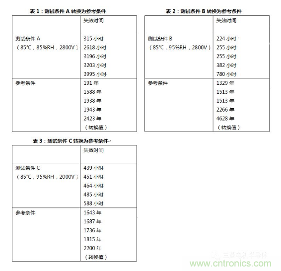 這裏,參考條件定義為RHu=75%,Tu=25℃和Vu=1500V。通過公式(1),可以得到測試條件A中的加速因子αf_A為5.31k,測試條件B中的加速因子αf_B為52.0k,測試條件C中的加速因子αf_B為32.8k。綜合這些加速因子,溫濕反偏試驗測試A、測試B和測試C轉換為如表1、表2和表3所示的參考條件。