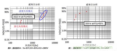3.3kV高壓IGBT的溫濕反偏試驗是在以下三個條件下測試:測試條件A(Ta=85℃,相對濕度=85%, VCE=2800V),測試條件B(Ta=85℃,相對濕度=95%, VCE=2800V),測試條件C(Ta=85℃,相對濕度=95%, VCE=2000V),測試結果如圖4,圖5和圖6所示。