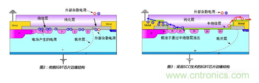 為了抑製IGBT芯片邊緣電荷集聚,SCC技術采用了優化的半絕緣性材料替代傳統的絕緣材料,這個半絕緣性層為集聚的載流子提供了通路,如圖3所示,在高濕工況下,產生的載流子會通過半絕緣層傳遞出去,避免了電荷的大量集聚。