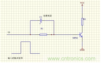 (1)加速導通過程。當輸入信號電壓Ui從OV跳變到高電平時,由於電容Cl兩端的電壓不能突變,加到VT1基極的電壓為一個尖頂脈衝,其電壓幅值最大,如圖3 (b)所示。這一尖頂脈衝加到VT1基極,使VT1基極電流迅速從OA增大到很大,這樣VT1迅速從截止狀態進入飽和狀態,加速了VT1的飽和導通,即縮短了VT1飽和導通時間(三極管從截止進入飽和所需要的時間)。